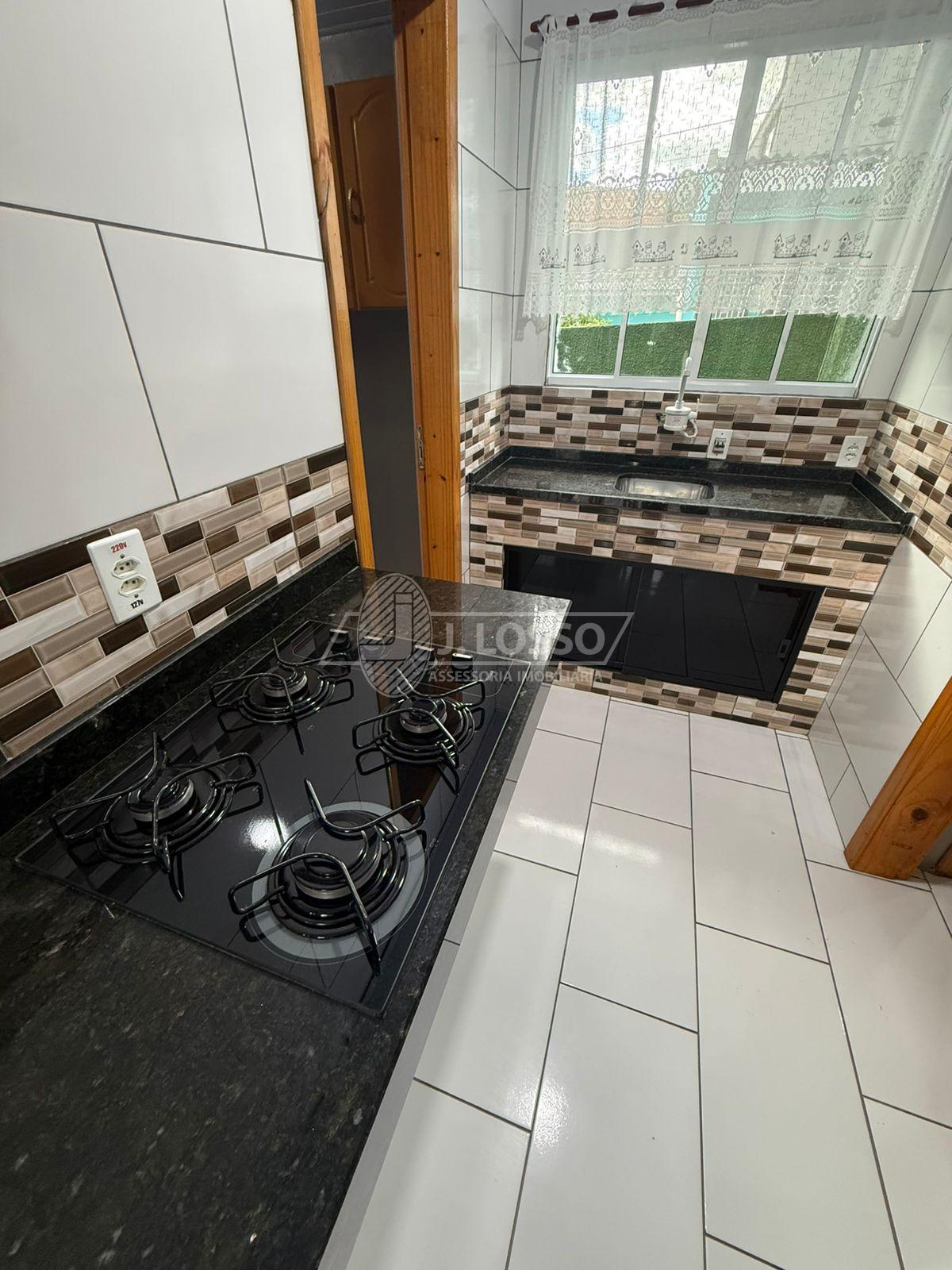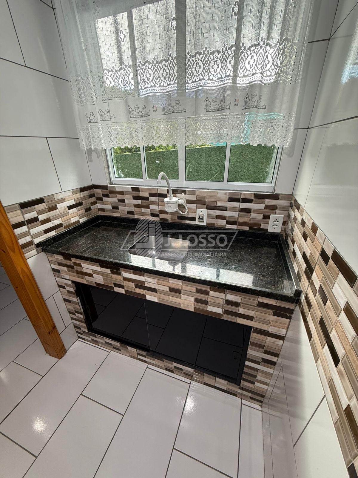 Cozinha com pia em alvenaria, revestida com lajotas e tampo em granito, com portas de vidro.